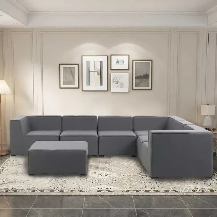 This modular sofa lets you mix and match pieces to create a layout that suits your needs—whether you want a spacious corner arrangement or a more compact setup with an ottoman.