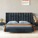 Elevate your bedroom aesthetic with this stunning bed frame, featuring a beautifully upholstered headboard and base. Its luxurious design infuses any space with a sense of elegance and sophistication, while the deep teal color adds a contemporary flair that’s effortlessly chic.