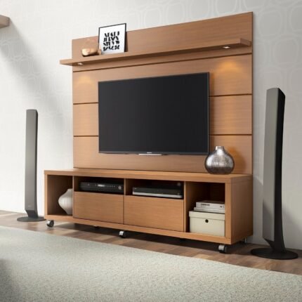 In the center, there’s a handy shelf that’s perfect for your game consoles, DVD/Blu-ray players, or streaming devices.