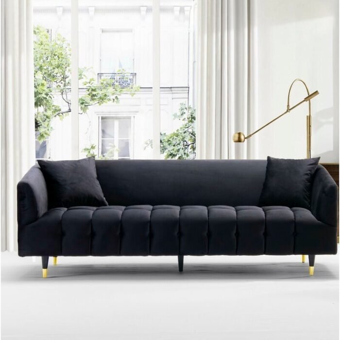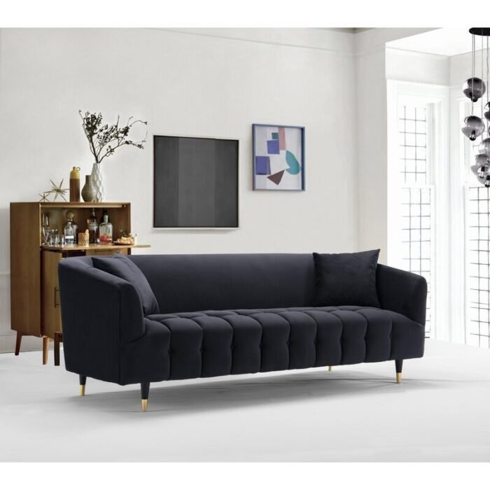 This sofa beautifully blends style and comfort, featuring a chic design that merges modern and contemporary elements. Not only does it stand out on its own, but it also pairs wonderfully with the matching club chair from the same collection. With its button-tufted cushions and channel quilting, plus soft velvet-wrapped arms, this sofa brings a touch of elegance to any space.