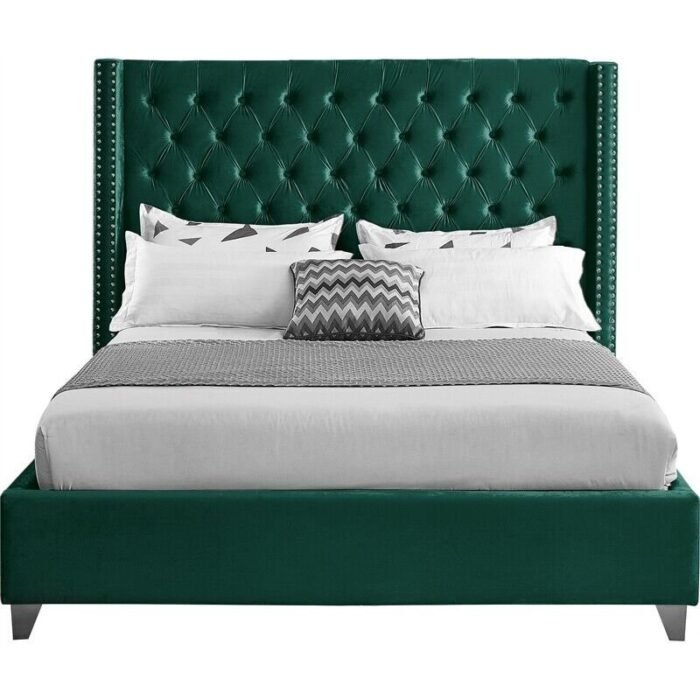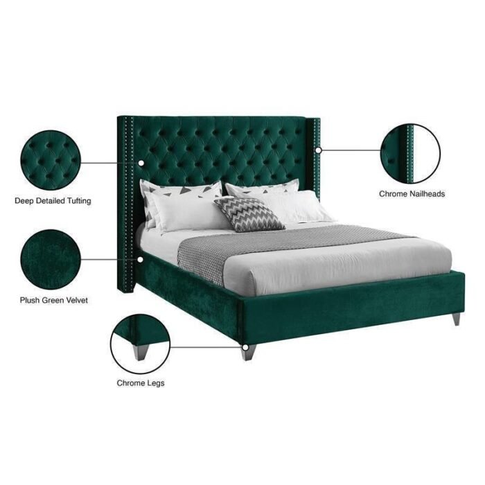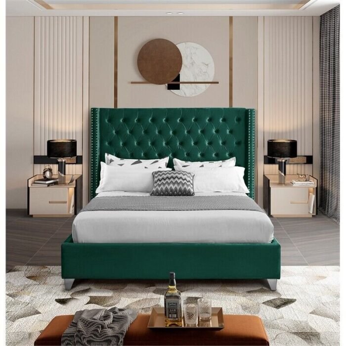 - Upholstery: Soft velvet for wall panels; fabric for bed upholstery.
