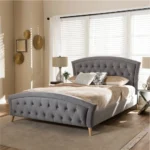 Elevate your bedroom with our modern fabric tufted bed, a stylish and inviting centerpiece that blends contemporary design with comfort. Its softly sloping shape and slender base create an elegant silhouette, while solid wood splayed legs in a natural finish add the perfect touch of warmth. Upholstered in luxurious grey velvet, this bed exudes opulence and sophistication. The medium-density foam filling provides a plush feel, making it a cozy retreat for relaxation.