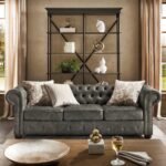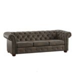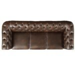 Introducing our luxurious brown PVC leather couch, perfect for unwinding after a long day. This spacious sofa brings a timeless elegance to any large living area, blending style and comfort seamlessly. With its rich brown upholstery, button tufting, and gently curled arms, it’s a stunning addition to traditional decor.