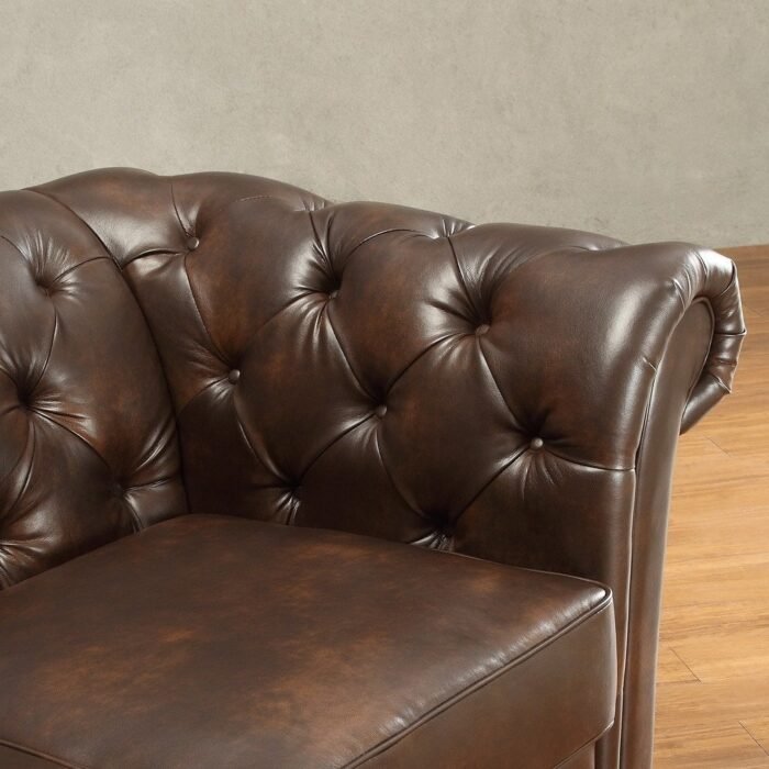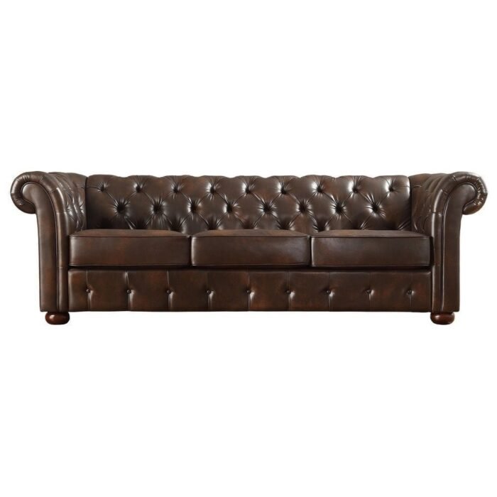 Introducing our luxurious brown PVC leather couch, perfect for unwinding after a long day. This spacious sofa brings a timeless elegance to any large living area, blending style and comfort seamlessly. With its rich brown upholstery, button tufting, and gently curled arms, it’s a stunning addition to traditional decor.
