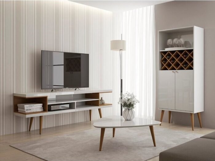 Elevate your living space with this stylish TV stand that beautifully blends quality construction, striking design, and modern functionality. Featuring elegant splayed wooden legs and four spacious shelves, it serves as a stunning centerpiece for your entertainment area.