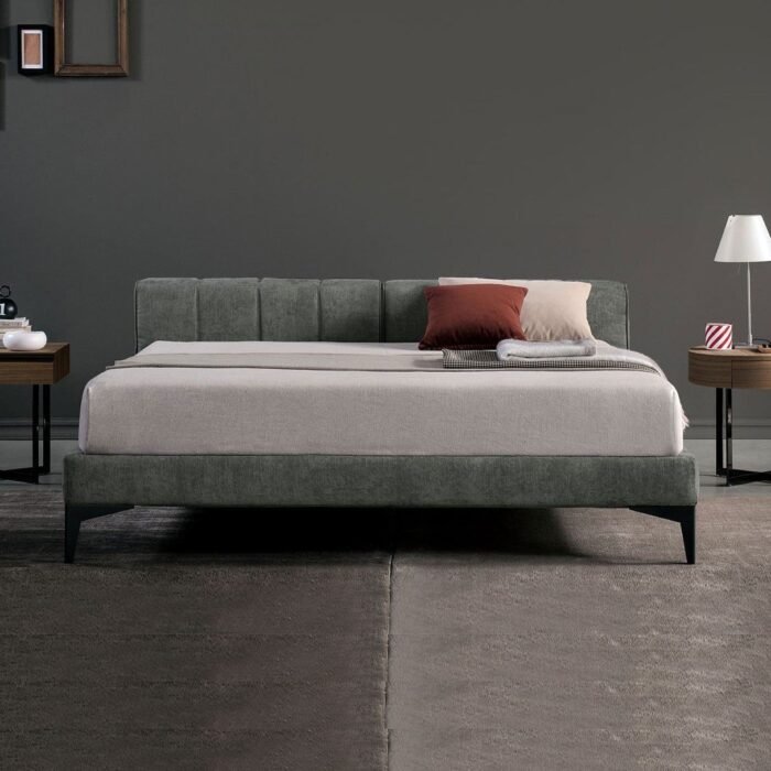 Upholstered in soft fabric, the headboard offers a plush feel and is available in various colors to suit your personal style. The sturdy frame ensures durability and support, while the low height creates an open, airy atmosphere in the room. Ideal for minimalist and eclectic designs alike, this bed invites relaxation and enhances the overall elegance of your sleeping space