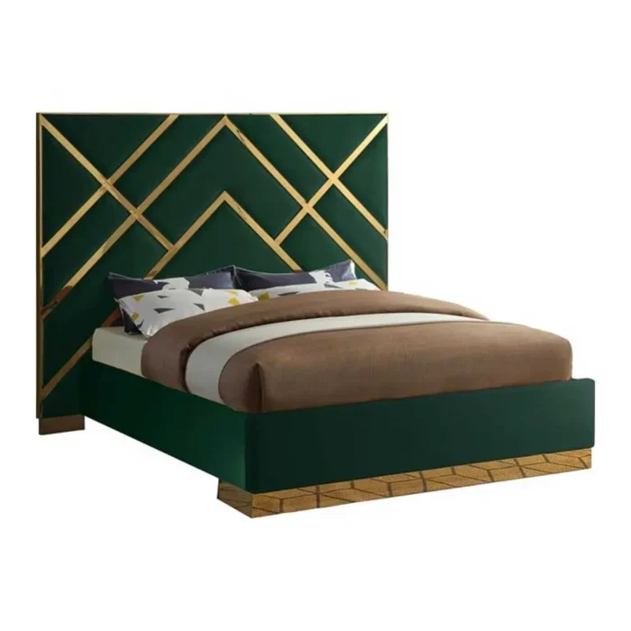 Transform your bedroom with the chic and luxurious velvet-upholstered bed that adds a touch of elegance to any space. Dressed in rich green velvet and featuring a polished gold metal geometric design, this bed is a statement piece that radiates sophistication.
