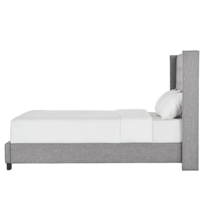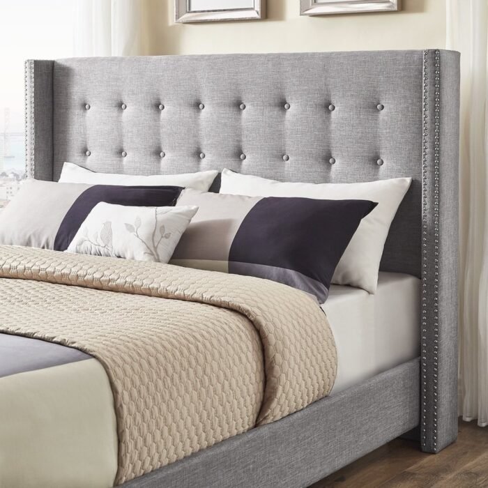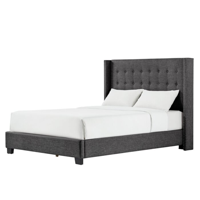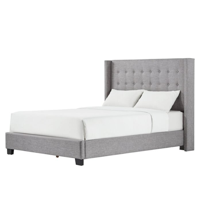 Transform your bedroom into a sophisticated retreat with this stunning wingback bed. Its classic elegance is enhanced by button tufting and two rows of silver nail head trim, making it a perfect addition to any decor. Available in beige, dark grey, or light grey, this bed effortlessly complements your personal style.