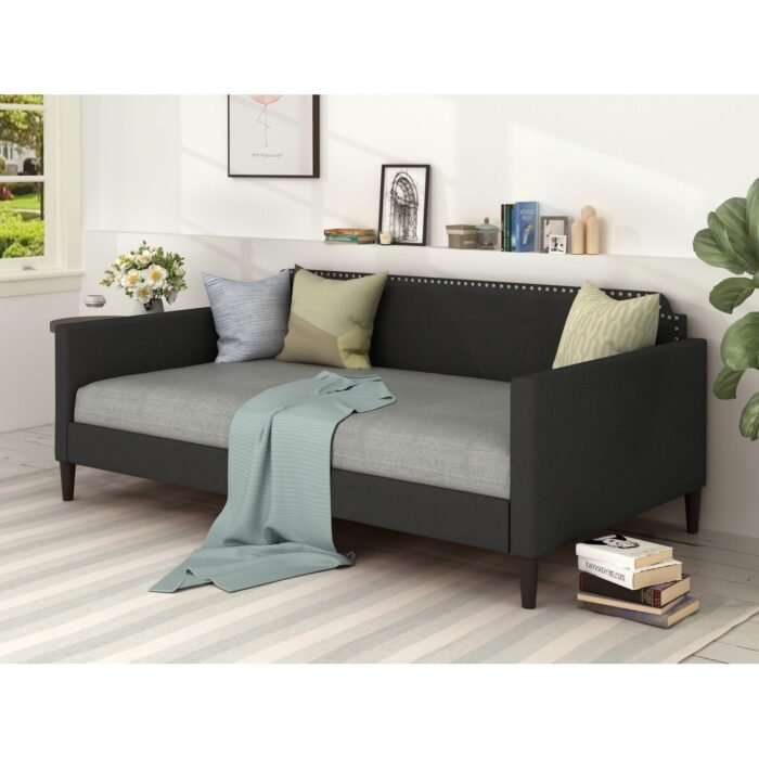 This charming vintage daybed is the perfect foundation for a twin-sized mattress, adding a touch of elegance to your bedroom or guest room. No box spring is needed, and its upholstered design with wood slats makes it both stylish and practical. The daybed easily transforms into a cozy lounge or a comfy bed, and it fits standard bed skirts effortlessly.