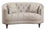 You’ll fall in love with the charm and style that the Avonlea couch brings to your semi-formal living room! With its unique slightly U-shaped curved back and cool gray upholstery, this couch is not just a piece of furniture; it’s a statement. The button tufting adds a touch of elegance, while the two rows of nail head trim along the edges give it a distinctive flair. Perfectly designed to seat two to three people, it’s sure to become the centerpiece of your space. Plus, matching mirrored coffee tables and loveseats are available separately to complete the look.