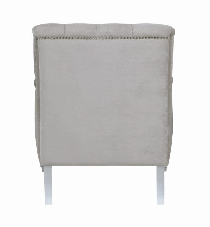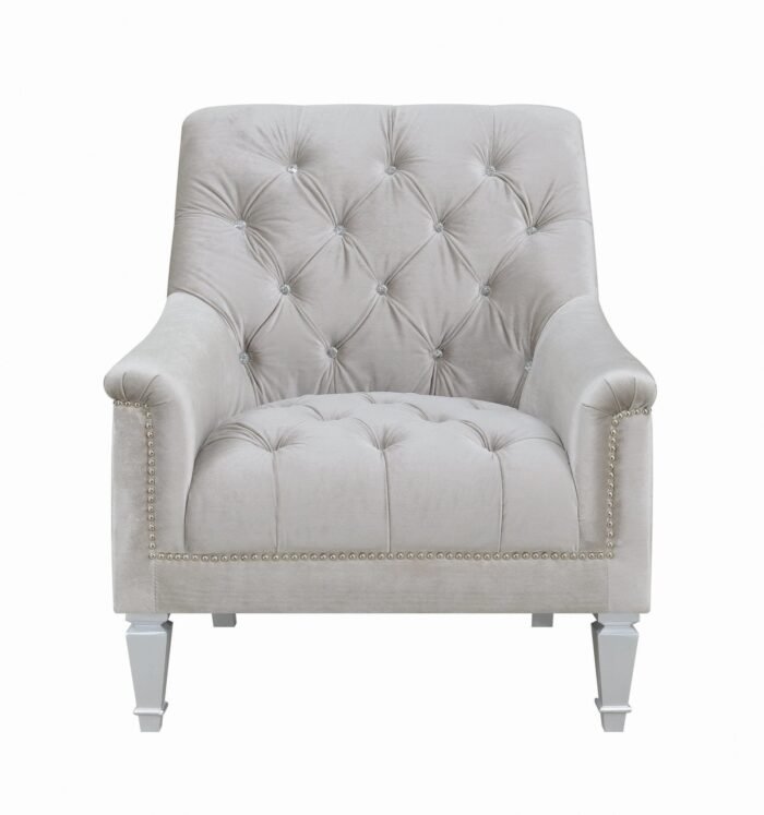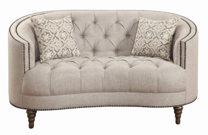 You’ll fall in love with the charm and style that the Avonlea couch brings to your semi-formal living room! With its unique slightly U-shaped curved back and cool gray upholstery, this couch is not just a piece of furniture; it’s a statement. The button tufting adds a touch of elegance, while the two rows of nail head trim along the edges give it a distinctive flair. Perfectly designed to seat two to three people, it’s sure to become the centerpiece of your space. Plus, matching mirrored coffee tables and loveseats are available separately to complete the look.