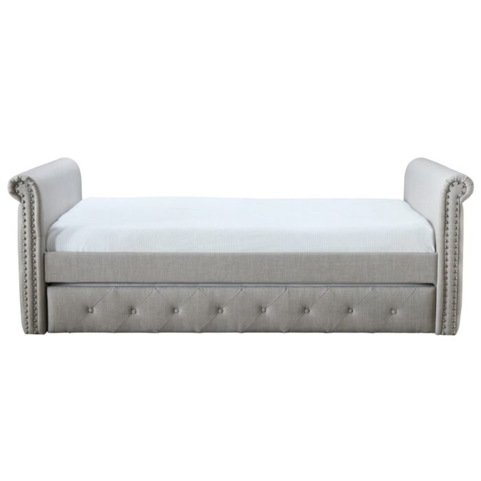 Transform a child’s room or guest bedroom with the charming Chester Daybed. This twin-sized upholstered frame brings a touch of elegance with its button-tufted sides and rolling arms, making it a cozy spot for relaxation and sleepovers. Plus, the handy pull-out trundle provides extra space for unexpected visitors!