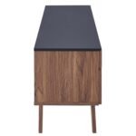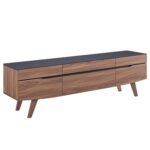The Scope 71″ TV Stand will help your living area embrace mid-century design. This TV stand has a straight profile with clean corners and has smooth walnut grain laminate, a solid particleboard frame, accents in contrast gray lacquer, splayed, sturdy legs, and six full-extension drawers for chic media storage. The design features sharp edges and a minimalist profile, supported by four sturdy, splayed legs that provide both style and stability. Plus, with six full-extension drawers, you’ll have plenty of chic storage for all your media needs, keeping everything organized and within reach. The modern living room, lounge, or entertainment area is the ideal place for Scope’s contemporary linear style.