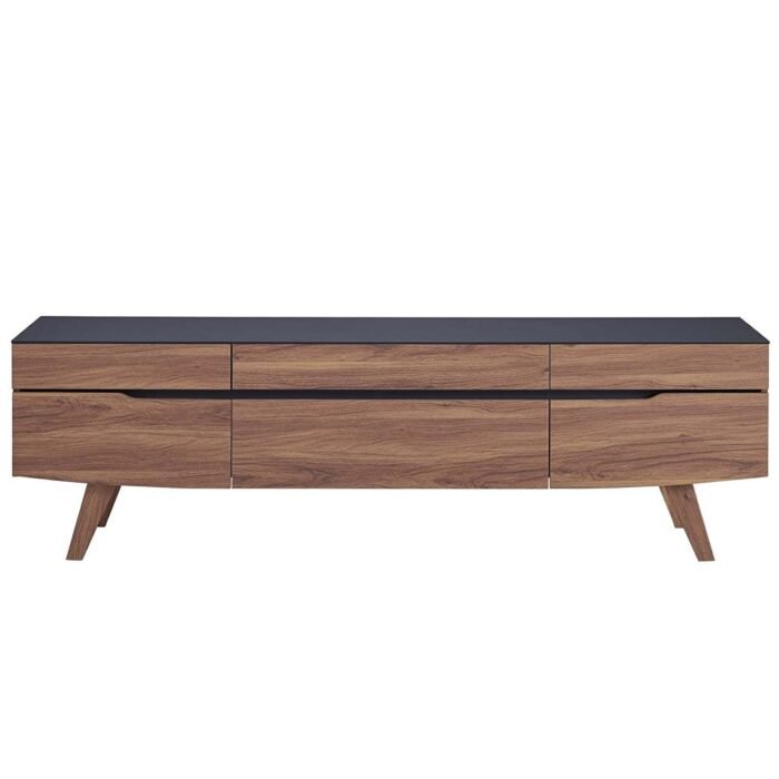 The Scope 71″ TV Stand will help your living area embrace mid-century design. This TV stand has a straight profile with clean corners and has smooth walnut grain laminate, a solid particleboard frame, accents in contrast gray lacquer, splayed, sturdy legs, and six full-extension drawers for chic media storage. The design features sharp edges and a minimalist profile, supported by four sturdy, splayed legs that provide both style and stability. Plus, with six full-extension drawers, you’ll have plenty of chic storage for all your media needs, keeping everything organized and within reach. The modern living room, lounge, or entertainment area is the ideal place for Scope’s contemporary linear style.