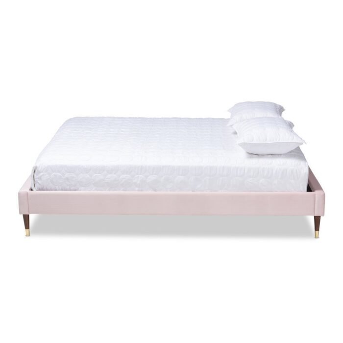 Elevate your bedroom’s style with the luxurious Volden bed frame. Crafted from solid wood and wrapped in plush, velvety upholstery, this bed promises ultimate comfort. Designed with both aesthetics and functionality in mind, it features elegant tapering wood legs accented with opulent gold-tone metal tips, adding a touch of sophistication while providing extra storage space.