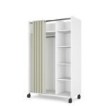 The armoire includes a clothing rack, perfect for hanging your favorite dresses and button-up shirts, while six open cubby shelves provide plenty of space for your jeans, sweaters, and shoes. Plus, four caster wheels make it easy to move around, and a grommet curtain adds a touch of charm while keeping everything neatly contained.