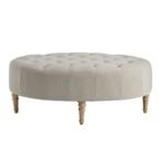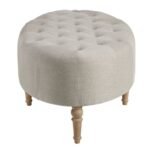 Elevate your living space with the Clara Accent Ottoman. Its button-tufted top, wrapped in a chic linen-like fabric, adds a touch of sophistication to any room. The solid wood legs, with a reclaimed natural finish, bring a warm, farmhouse-inspired feel that beautifully complements the upholstery.